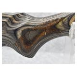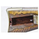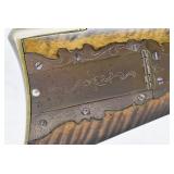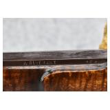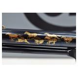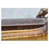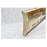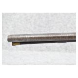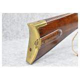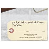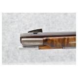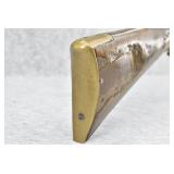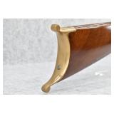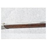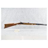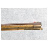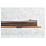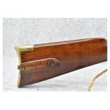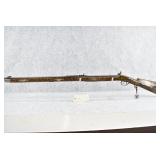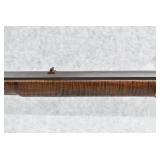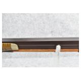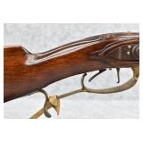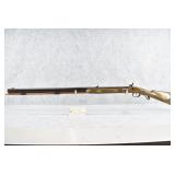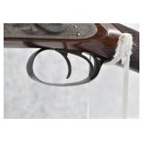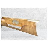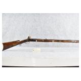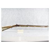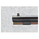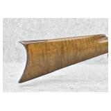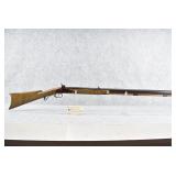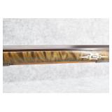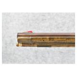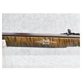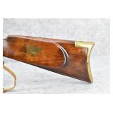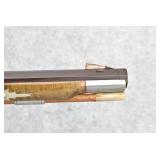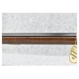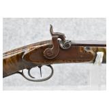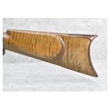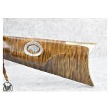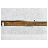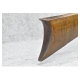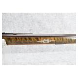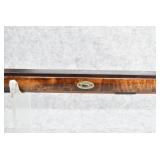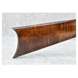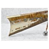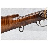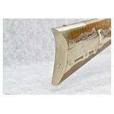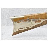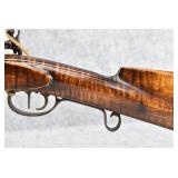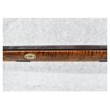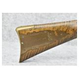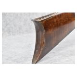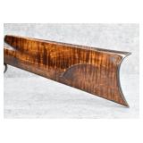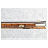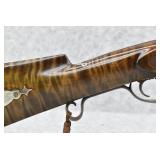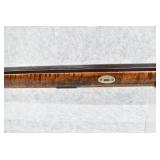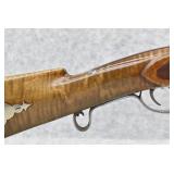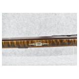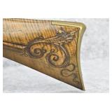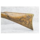 260. Custom J. Rinehart – 54 Cal. Custom Contemporary Percussion Black Powder Full Stock Rifle – w/36” Octagon Barrel w/Blade Front & Long Base Ornate Buckhorn Rear Sights – Brown Finish – w/Straight Grip Full Length Curly Maple Wood Stock w/Crescent Metal Butt Plate & Silver 4pc. Patchbox – Left Side of Butt Stock Has a Silver Inlay of a Buffalo, as Well as the J. Rinehart Name Plate – w/Double Set Triggers – w/Wooden Ram Rod