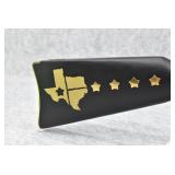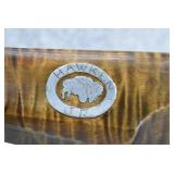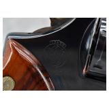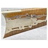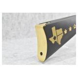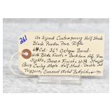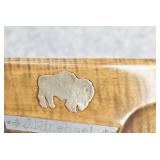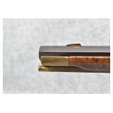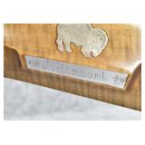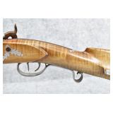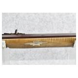 264. Custom Contemporary Hawken Jr. Style Rifle – 54 Cal. Percussion Black Powder Rifle – w/35” Octagon Barrel w/Blade Front & Large Ornate Base Buckhorn Rear Adj. Sights – Brown Finish – w/Straight Grip Full Length Curly Maple Wood Stock w/Raised Cheek Piece w/Crescent Metal Butt Plate w/Silver Furniture – w/Buffalo Emblem & Star Inlays on Left Side of Stock – w/Double Set Triggers – w/Wooden Ram Rod