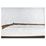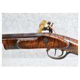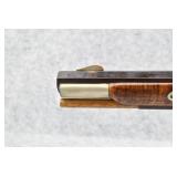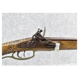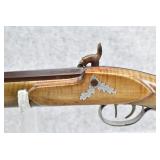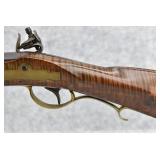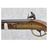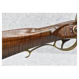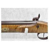 263. Signed J. Rinehart-REF – Custom Contemporary Kentucky Rifle – 54 Cal. Flintlock Black Powder Rifle – w/34” Octagon Barrel w/Blade Front & Buckhorn Rear Adj. Sights – Brown Finish –– w/Straight Grip Curly Maple Full Wood Stock w/Raised Cheek Piece w/Crescent Metal Butt Plate w/Silver Furniture – w/Double Set Triggers – w/Wooden Ram Rod