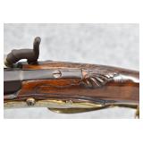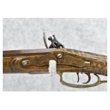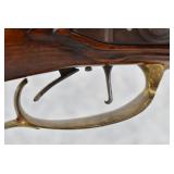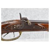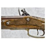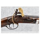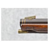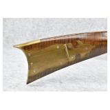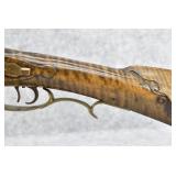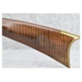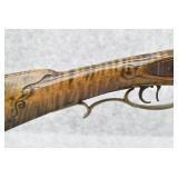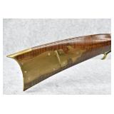 259. Signed N.A. Panarella – 45 Cal. Custom Contemporary Flintlock Black Powder Rifle – w/42” Octagon Barrel w/Blade Front & Notch Rear Adj. Sights – Brown Finish – w/Curly Mable Full Length Wood Stock w/Raised Cheek Piece w/Brass Butt Plate, Brass 4pc. Patchbox & Brass Furniture w/Light Ornate Carving on Butt Stock – w/Double Set Triggers – w/Wooden Ram Rod