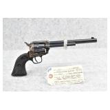 273R. Colt – Mod. Peacemaker Buntline – 22LR Cal. Single Action Revolver – w/7.5” Blued Barrel w/Front Blade & Grooved Rear Sights – Blued Finish w/Case Hardened Receiver – w/Black Rampant Colt Plastic Grips w/Eagle – Single Cylinder Model – Mfg. 1972