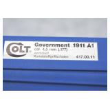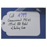 216R. Colt – Mod. Government Model (02991) – 38 Super Cal. Semi-Auto Pistol – w/5” Barrel w/3-Dot Blade Front and Adjustable Rear Notch Sights – Blued Finish – w/Factory Checkered Wood Grips – Unfired w/Factory Colt Hard Case, Manuals, Accessories, and 2 Factory Detachable Magazines