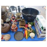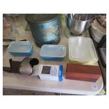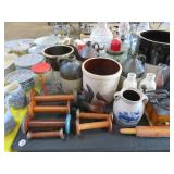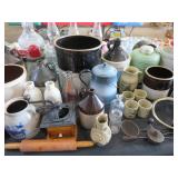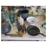 MORE: KitchenAid mixer; Dazey churn; Pyrex refrigerator dishes; Corning ware casseroles with lids; Old lantern; Minnow bucket; Stoneware jug; Pyrex measuring cups; Oil lamps; Red rimmed white enameled kitchen pans; Meat grinder; Cast iron frying pans; Sad irons; Screw nutcracker; Cast iron kettle; Lots of old bottles; Lots of blue canning jars; Canning funnels; Old razor strop; Cast iron kettle with hanging handle; Chess set; Butter churn; Pickling crock; Blue graniteware pail; Graniteware coffee kettle; Thermos;