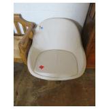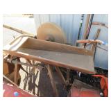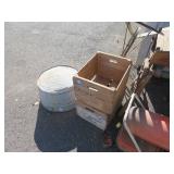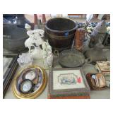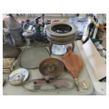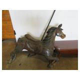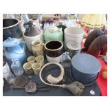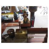 Old, full size carousel pony with support pole; Snuff bottles; Old metal gas can; Old kid’s trike; Honing wheel; Long handled tools; Fruit crates; Galvanized wash tub; Shop heater; Galvanized mop bucket with wringer; Fire mark; Salt lamp; Faux grapes; Old car horn; Coffee grinders; Tabletop churn; Wooden bobbins; Rolling pin; Glass sugar canister; Spittoon; Metal soldiers; Plane model; Civil War currency & buttons in frame; Old shaving plane; Copper ewer; Bookends; Cast iron griddle; Still bank;