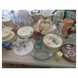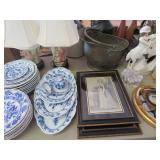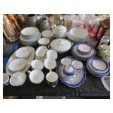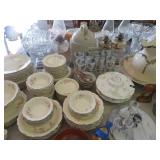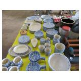 CHINA & GLASS: Herend Chinese Bouquet tea set; Roseville teapot; Collectible cup & saucer; Blue Onion china; Ceramic table lamps; Washbowl & pitcher set; Cake stand; MCM swan vase; Dinnerware sets; Covered tureen; Water pitcher; Large East Indian picture charger; Capodimonte floral basket; Ashtrays; Cream pitcher; 30+ Bossuns; Large blue spongeware dinnerware set including casseroles, flowerpots, ramekins, mixing bowl; plates, platters & more; Blue Willow; Hummels; Bells; Beswick figurines; Royal Albert figurines & more!