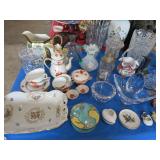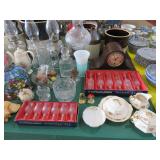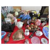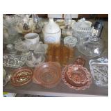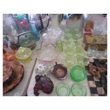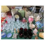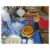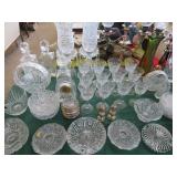 Lots of cut crystal-bowls, basket, goblets, plates, vases, ashtrays & more; Glass basket; Waterford; Clock; Hurricane; Biscuit jar; Candlesticks; Cut crystal; Oil lamps; Stemware sets; Large vases; Decanters; Art glass; Pyrex refrigerator dishes; Corning ware casseroles with lids; Pyrex measuring cups; Punch bowl & cups; Goofus glass platter & plates; Carnival glass bowl; Green depression; Set of leaf glasses in metal carrier; Cruet; Candy dish; Leaded glass hanging light shade; Cristal d’arques goblets in boxes; Ruby red tumblers; Blue rabbit on nest; Red cut to clear stag stein; Pink Depression & more!