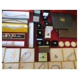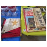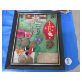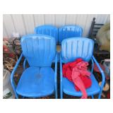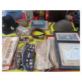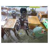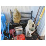 Nice set of 4 metal porch chairs; Garden statue of dog with flower basket; Large squirrel statue; Gulf Oil large metal can; Metal wheel; Massive copper charger; Military metal in framed display; Military collectibles book; Other military books & ephemera; “Japs Surrender” newspaper; Spats; Helmet; Belt; Caps with pins; Nazi stamps; Knapsack; Booklets; Flag; Earrings; Fine & costume jewelry ready for gift giving; Copper mugs; Smoking pipes; Nippers; 45 records boxes; Chess sets;