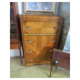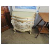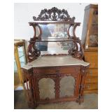 FURNISHINGS: Wonderful old punched tin pie safe over drawer & double door cabinet; Fantastic mirror back buffet, marble top & super fancy carving; Gold painted vitrine with glass shelves; Drop front secretary; Impressive bowfront china with paw feet and carved top panel; Table with sunburst inlay top; Grandfather clock in rectangular case; Nicely carved gaming table; Set of chrome & upholstery dining chair; Display cabinet on cabriole legs; Beautiful corner cabinet; White & gold bombe’ cabinet; Victorian table with claw & glass ball feet; Double bowfront curio cabinet; Waterfall dresser;