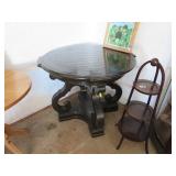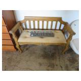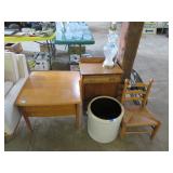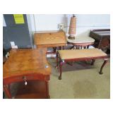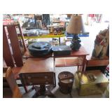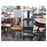 Carved bear table lamp; Drop side 2 drawer sewing stand; Brass kindling box; Wall clock; 2 drawer table; Small cabinet; Bookrack; Nesting table set; Small bench; Drop front desk; Turtle shaped marble top table; Table with parquet inlay top; Buffet; Pair of upholstered chairs; Washstand; Barstools with woven seat; Magazine holder; Rocking chairs; Birthing chairs; Display table; Crystal lamp; Nicely framed mirror; Crystal chandelier; String of faux peppers; Great Oriental rugs & carpets; Lots of Decorator accents & lots more!