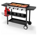 ROVSUN 4 Burner Portable Propane Griddle with Nonstick Enameled Tray, 40000 BTU Rolling Flat Top Gas Grill with Electronic Ignition, Side Shelves & Regulator for Outdoor Cooking Camping BBQ Tailgating