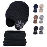 Winter Beanie Scarf Sets Warm Knit Hat, Fleece Lined Skull Cap Knitted Scarf Earflap Hat for Winter