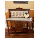 · Vintage Furniture: Chinoiserie Ming Style Table, Chippendale Style Chairs with Rush Seats, Captain’s Mate Bar Stools (2), Bombe Marble Top Chest of Drawers