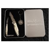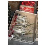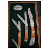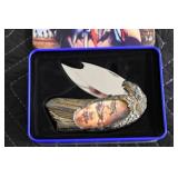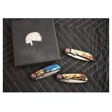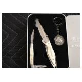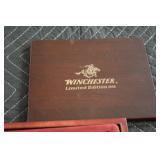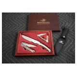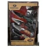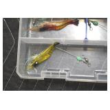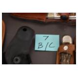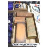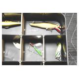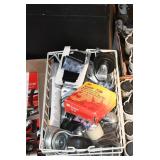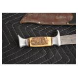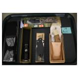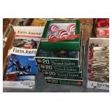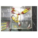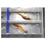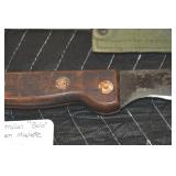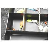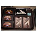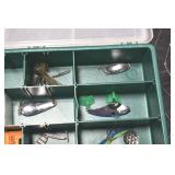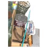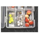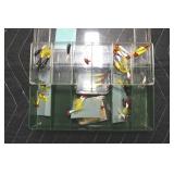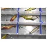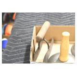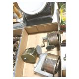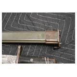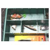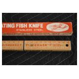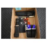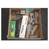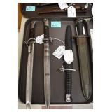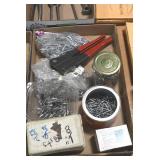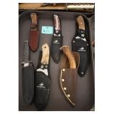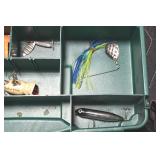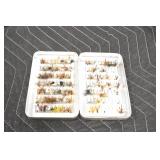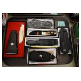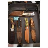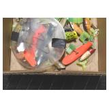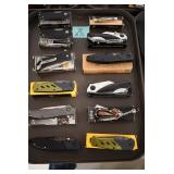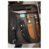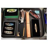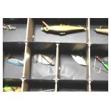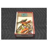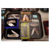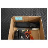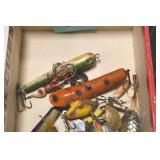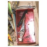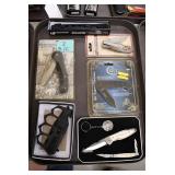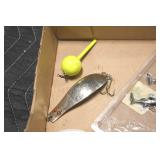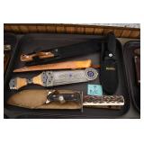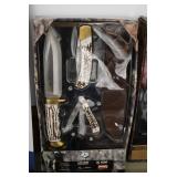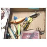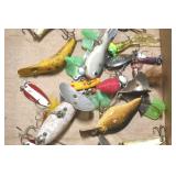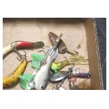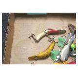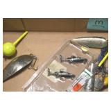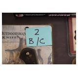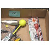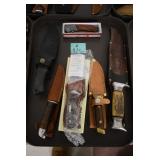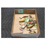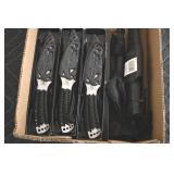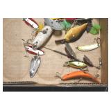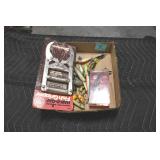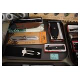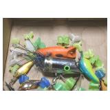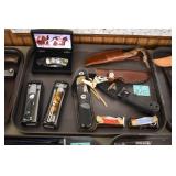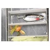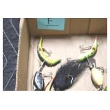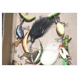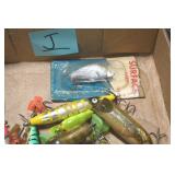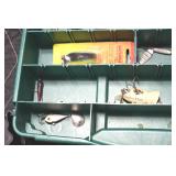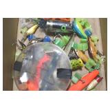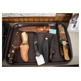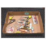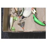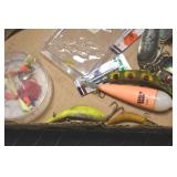 Sporting and Fishing Related: (9) Various Machetes, Winchester Flashlight, Various Ammunition, Brass, Powder Horns, Powder Flasks, Large Amount of Folding, Pen, and Sheath Knives, Decoys, Fishing Rods, Large Amount of Fishing Lures, Fishing Flies, Reels, Tackle, and Other
