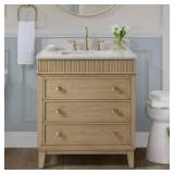 30 in. W x 22 in. D x 35 in. H vanity with engineered marble top Includes 2-hardware sets, 3-soft-close drawers Includes top, backsplash and single sink; faucets not included