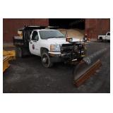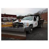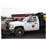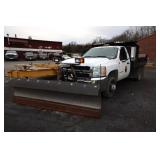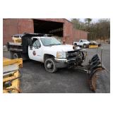 Items include 2008 Chevrolet Silverado 3500HD Dump Truck, 1990 Eager Beaver trailer, 2005 Chevrolet Silverado 2500HD Pickup Truck, 2013 Ford Taurus Police Interceptor, John Deere tractor, and Gravely Tractor Walk Behind Sweeper. Items are located in New Paltz, NY.