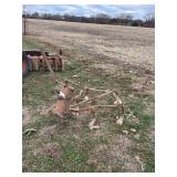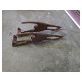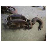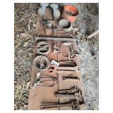36 Antique Tools, hay hooks, horns, pulley, monkey wrenches, planter plates and misc