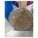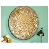 - This eclectic style inspired design gold iron wall plaque features a round design with an elaborate flower embossed on the surface with leaves and adornments