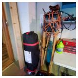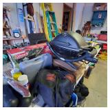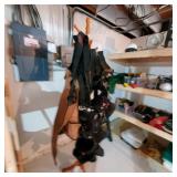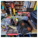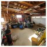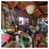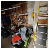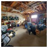 The garage is PACKED — tools, equipment, and outdoor items everywhere you look.