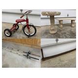 = Nice Garden Bench And Bird Bath = Heavy Duty = Both Items Are In Good Shape And Have Been Stored Indoors = Both Items Disassemble = Bench Dimensions, 17" Tall x 41" Long = Bird Bath, 27" Tall
