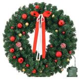 VINGLI 24 Inch Pre lit Artificial Christmas Wreath for Front Door Battery Operated Xmas Wreath with 50 LED Lights 100 PVC Tips Bow Pine Cones and Ornaments for Holiday Door Decoration