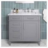 36" W x 22" D x 34" H wood vanity with durable Carrara Marble top Features chrome hardware, 2 soft-close drawers & 1 cabinet door Includes top, backsplash and single sink; 8" faucet not included