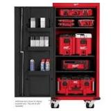 Cabinet set includes a multi-use locker, a wall cabinet and a five-drawer base cabinet Total product weight: 495 lbs. Pre-assembled Integrated cord grommets in the back wall allow you to charge power tools or leave gear like air compressors plugged in while keeping them organized and safe behind a three-way locking door Integrated pegboard for additional storage Unique sleeved bottom skirt hides feet Add casters to any base cabinet for mobile tool storage (casters sold separately)