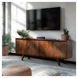 Harmony brings elegance to any room with its unique wood grain pattern and rich, organic tones, adding a sophisticated touch that instantly elevates your space. Its perfect size accommodates TVs up to 75 inches, while also offering ample surface area for decorations and personal accents. Designed with comfort in mind, the elevated structure provides the ideal viewing height, helping to reduce eye strain and neck discomfort for a more enjoyable entertainment experience. Two spacious cabinets, complete with ample shelving, provide plenty of room for storing electronics, media, and accessories, ensuring a well-organized living space.