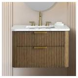 This wall-mounted vanity combines a streamlined silhouette with elevated detailing to bring modern function to your bathroom. The engineered stone countertop in Arabescato offers a clean, high-contrast surface, while the slatted base adds texture and warmth. A center-set undermount ceramic sink pairs with a soft-close, full-extension drawer to keep daily essentials neatly stored. The U-shaped interior accommodates plumbing without sacrificing space, and a flip-down tray adds extra convenience. Plus, with brushed hardware and curved edges, it delivers a sleek, finished look that fits effortlessly in contemporary or transitional spaces.