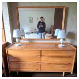 Eames Lounge Chairs, Gerald Thurston Floor Lamp, Lane Tuxedo Dining Table & 4 Chairs, Rolling Serving Cart Tea Bar Foldable Yugoslavia NASCO, Crawford Furniture solid birch 6-drawer dresser with mirror, nightstand and Milo Baughman Style Solid Wood 6 Drawer Highboy Dresser, D Scan dining chairs and a lot More Mid Century Furniture and Decor