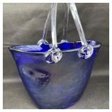 Lot #183 - Hand-Blown Cobalt Blue Art Glass Basket w/ Clear Handle Studio Style