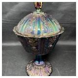 Lot #180 - Vintage Fenton Carnival Glass Covered Compote Iridescent Pedestal Candy Dish