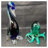 Lot #232 - Hand-Blown Art Glass Bird & Octopus Figurines Studio Glass Sculptures Display Pair