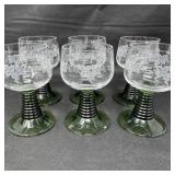 Lot #177 - Vintage Bohemian Etched Grapevine Wine Goblets w/ Green Stems Set of 6