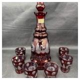 Lot #175 - Vintage Bohemia Ruby Cut Glass Decanter Set w/ Shot Glasses Czechoslovakia