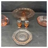 Lot #83 - Vintage Pink Depression Glass Serving Lot Cake Stand, Bowls, Plates, Creamer & Shakers