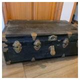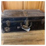 Lot #198 - Antique Black Metal Steamer Trunk with Brass Locks