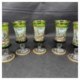 Lot #176 - Vintage Bohemian Green Enamel Scenic Cordial Goblets Set of 5 Czech Gilt Glasses