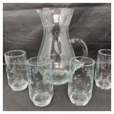 Lot #178 - Princess House Etched Floral Glass Pitcher & Tumbler Set Vintage Clear Glass