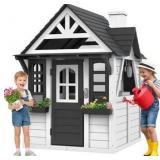 Outdoor Playhouse for Kids Ages 4-8, Wooden Play House with Doorbell, Phone, Kitchen Toys, Outdoor Kids Play Equipment, Casa Para Niñas (45”L x 65”H), White & Black
