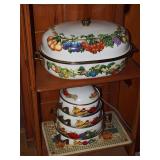 1153 Cooking Items on Table - Forman, Bundt Pan, Enamel Steamer Pot.