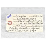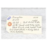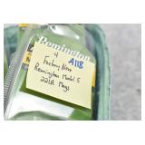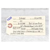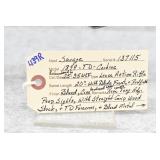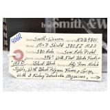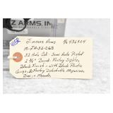 413R. Smith & Wesson – Mod. 2206TGT – 22LR Cal. Semi-Auto Pistol – w/6” Barrel w/Front Blade and Adjustable Rear Sights – Stainless Finish – w/Factory Wood Grips – w/Magazine Release in Grip – w/2 Factory Magazines – w/Factory Hard Case and Manuals – Mfg. Between 1991-1999 414R. Smith & Wesson – Mod. SW380 – 380 ACP Cal. Semi-Auto Pistol – w/3” Barrel w/Iron Front and U Notch Rear Sights – w/Black Polymer Frame – w/Magazine Button Release on Magazine Bottom – w/Factory Hard Case and Smith & Wesson Tool 415R. Jimenez Arms – Mod. JA-32-CGB – 32 Auto Cal. Semi-Auto Pistol – w/2¾” Barrel w/Factory Sights – Black Finish – w/Black Plastic Grips – w/2 Factory Detachable Magazines – w/Box and Manuals 416R. G.S.G. – Mod. GSG-922 – 22LR Cal. Semi-Auto Pistol – w/3½” Barrel w/3-Dot Sights – Matte Blued Finish – w/Factory Checkered Synthetic Grips – w/Factory Magazine – w/Factory Hard Case and Manuals 417R. G.S.G. – Mod. Fire Fly – 22LR Cal. Semi-Auto Pistol – w/4” Barrel w/3-Dot Sights – O.D. Green Finish – w/Factory Synthetic Grips – New and Unfired w/Factory Hard Case, Manual, and Factory Magazine 418R. Smith & Wesson – Mod. SW99 By Walther – 40 S&W Cal. Semi-Auto Pistol – w/4” Barrel w/3-Dot Blade Front and Adjustable Rear Notch Sights – Blued Finish – w/Black Polymer Frame and Grips – w/2 Factory Detachable Magazines – w/Smith & Wesson Hard Case, Manual 419R. Remington – Mod. 700 – Stainless Receiver Only – For Regular Short Action Calibers – New in Factory Box w/Manual – No Bolt or Trigger 420R. Remington – Mod. 700 Stainless Receiver Only – For Long Action and Long Action Magnum Calibers – New in Factory Box w/Manual – Note: No Bolt or Trigger 421R. CZ USA – Mod. CZ-457 – 22LR Cal. Bolt Action Rifle – w/16” Barrel w/Hooded Front and Adjustable Rear Sights – Blued Finish – w/Pistol Grip Wood Stock w/Butt Plate – w/Factory Detachable Magazine – w/Threaded Muzzle and Muzzle Cap 422R. Mossberg – Mod. 500A “Home Defense” – 12ga. 3” Pump Action Shotgun – Cut Down to 18½” Vent Rib Cyl. Bore Barrel w/Bead Sight – Blued Finish – w/Black Synthetic Pistol Grip Stock w/Checkered Wood Forearm 423R. Mossberg – Mod. 500 JIC Cruiser NRA Edition – 12ga. 3” Pump Action Shotgun – w/18½” Cyl. Bore Barrel w/Bead Sight – Matte Blued Finish – w/Black Synthetic Pistol Grip Stock w/Ribbed Forearm – w/15” Tubular Magazine 424R. Mossberg – Mod. 500 Tactical – 12ga. 3” Pump Action Shotgun – w/19” Cyl. Bore Barrel w/Bead Sight, Heat Sheild, Add-On Muzzle Break, and Picatinny Rail for Light – Matte Blued Finish – w/Black Synthetic Pistol Grip Stock w/Ribbed Forearm 425R. Winchester – Mod. 190 – 22 Cal. Semi-Auto Rifle – w/20½” Barrel w/Blade Front and Adjustable Rear Sights – Blued Finish – w/Smooth Pistol Grip Wood Stock and Forearm w/Factory Black Plastic Butt Plate – w/Full Length Tubular Magazine – w/Weaver Marksman 4x Scope and Mounts – Note: Chipped Toe! 426R. Remington – Mod. 514 – 22 Cal. Single Shot Bolt Action Rifle – w/24¾” Barrel w/Factory Sights – Blued Finish – w/Smooth Pistol Grip Wood Stock w/Factory Black Plastic Butt Plate 427R. Remington – Mod. 870 Express Magnum – 12ga. 3” Pump Action Shotgun – w/21” Smoothbore Slug Barrel w/Rifle Sights – Matte Blued Finish – w/Checkered Pistol Grip Wood Stocks w/Factory Recoil Pad 428R. Remington – Mod. 870 Express Magnum – 12ga. 3” Pump Action Shotgun – w/28” Rem. Choke, Vent Rib Barrel w/Bead Sight – Matte Blued Finish – w/Checkered Pistol Grip Wood Stock and Forearm w/Factory Black Rubber Butt Pad 429R. Ithaca – Mod. 37 – 12ga. Pump Action Shotgun – w/30” Full Choke Barrel w/Fiber Optic Bead Front Sight – Brown Finish – w/Checkered Capped Pistol Grip Wood Stock and Ribbed Forearm w/Hy-Gun Brown Rubber Butt Pad – w/Enhanced Receiver on Both Sides w/Wild Fowl and Hunting Scenes 430R. Browning – Mod. Superposed Lightning – 12ga. Over/Under Shotgun – w/30” Full/Mod. Choke, Simmons Extra Wide Vent Rib Over/Under Barrels w/Double Bead Sights – Blued Finish – w/Deluxe Checkered Capped Pistol Grip Wood Stock w/Pachmayr Black Rubber Butt Pad – w/Single Select Trigger – w/Enhanced Frame on All Sides w/Floral Scrolling 431R Remington – Mod. 597 – 22LR Cal. Semi-Auto Rifle – w/20” Barrel w/Blade Front Sights – Matte Blued Finish – w/Camoed Mossy Oak Break Up Pistol Grip Synthetic Stock w/Factory Butt Plate – w/Detachable Magazine – w/4-12x42mm Scope, Rings 432R. Savage – Mod. 110 – 30-06 Sprg. Cal. Bolt Action Rifle – w/22” Barrel w/Beaded Front and Adjustable Rear Ramp Sights – Blued Finish – w/Checkered Pistol Grip Wood Stock w/Factory Recoil Pad – w/Leupold Scope Base 433R. Stevens – Mod. 77F – 16ga. Pump Action Shotgun – w/28” Mod. Choke Barrel w/Bead Sight – Blued Finish – w/Smooth Pistol Grip Wood Stock and Ribbed Forearm w/Factory Black Plastic Butt Plate 434R. Remington – Mod. 770 – 308 Win. Cal. Bolt Action Rifle – w/22” Barrel – Matte Blued Finish – w/Synthetic Capped Pistol Grip Stock w/Factory Recoil Pad – w/Factory Magazine – w/3-9x40 Scope w/Rings and Base 435R. Browning (St. Louis, MO) – Mod. A5 – 12ga. Semi-Auto Shotgun – w/30” Full Choke Barrel w/Bead Sight – Blued Finish – w/Checkered Capped Pistol Grip Wood Stock and Forearm w/Red Head Red Rubber Butt Pad – w/Enhanced Receiver on Both Sides 436R. Remington – Mod. 1100-LT-20 – 20ga. Semi-Auto Shotgun – w/21” Vent Rib Rem. Choke Barrel w/Bead Sight – Matte Blued Finish – w/Checkered Black Synthetic Pistol Grip Stock and Forearm w/Factory Black Rubber Butt Pad 437R. Savage – Mod. 110 – 270 Win. Cal. Bolt Action Rifle – w/22” Barrel – Blued Finish – w/Checkered Capped Pistol Grip Black Synthetic Stock w/Factory Butt Pad – w/Bushnell 3-9x40mm Scop