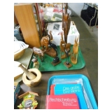 ANTIQUES/COLLECTABLES, MISCELLANEOUS: Craftsman work bench, craft making tools, Irish wool sweaters, German radio, vtg German games and game sets, Montgomery School wooden toys, Cabbage Patch dolls, Cabbage Patch porcelain dolls, linens, wooden carved animals, vtg dresser sets, Pyrex mixing bowls, Gorham glassware, cook/bakeware, Irish linen, Cashmere scarf, Cashmink scarf, purses, nice selection of new women's and men's shoes and sneakers, Barbie's grooming display stand, Bethlehem Steel flags, ephemera, advertising thermometer, adv old German calendars, adv tray lots and tins, made in Japan/Germany/Hungary barn lanterns, tinware, video systems and games, war ration displays, Mr. Peanut peanut butter maker, red lantern globes, enamelware, insulators, rug beaters, beer and soda advertising, vtg kitchen gadgets, Santa blow mold, camel blow mold, vtg hose reel, Goebel figurines, Steiff animals, costume jewelry, 10K & 14k, new men and women's clothes including Armani/Polo/ Ninaricci/Versace, Dolce-Gabbona; music tour books, art glass, cups and saucers, dragon marionette, assort perfume, Barbies, Longaberger baskets and pottery, sports collectables, Hot Wheels, GI Joe footlocker, pet supplies, Build-A-Bear clothing, Corelle, gem stones, carnival glass, 45's, Lenox figurines, movie posters, Robo Sapien, pool sticks, sports ephemera, Magic the Gathering, Elvis cards, Aztec carved figures, Disney The Seven Dwarfs, Furbies, doll carriages and furniture, assorted vtg dolls, 1961 "Rumpus Room bobblehead", CD's, DVD's, luggage MORE