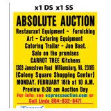 LIST UPDATED ABSOLUTE AUCTION! On-site: “CARROT TREE” Restaurant 1303 Jamestown Road (Colony Square Shopping Center) Williamsburg, Va. 23185 Monday, February 16th at 10 am Preview 8:30 am Auction Day