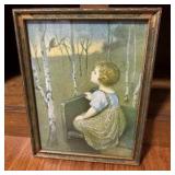 - Lot #347 - Vintage Framed Print of Girl Sitting on Bench with Bird in Birch Tree Forest
