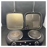 - Lot #74 - Vintage Farberware Electric Double Burner Hot Plate with Square Grill and Griddle Pans