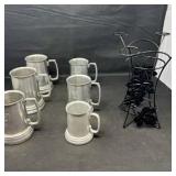 - Lot #81 - Vintage Pewter Beer Mugs with Iron Wine Holder Stand