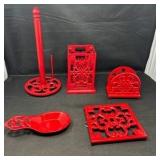 - Lot #60 - Vintage Red Cast Iron Kitchen Accessories Set