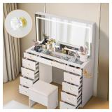 Pamapic Glass Top Vanity Desk with Crystal Handles, 11 Drawers Makeup Vanity with Mirror and Stool, 3 Lighting Modes Dressing Table, Power Outlet, Silent Slides, White