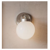 - Industrial-inspired wall sconce with white globe shades