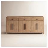 The credenza is a stunning blend of mid-century modern design and practical storage. Its light wood finish with dark graining creates a warm and inviting aesthetic. The combination of long steel handles and rounded metal pulls adds a touch of industrial chic, while the ample storage space makes it a functional and stylish addition to any room.